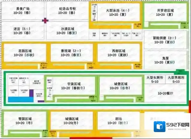 4.面积类建筑都是10*20的布局。区域面积都是200,个别设施门口有买票处的,要减掉那部分,实际面积大概180+。