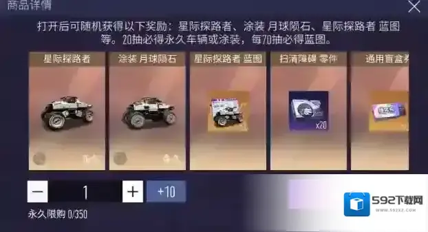 星际探路者秘宝将于2月24日上线特惠秘宝,打开后可随机获得以下奖励:星际探路者、涂装 月球陨石、星际探路者蓝图等。20抽必得永久车辆或涂装,每70抽必得蓝图。