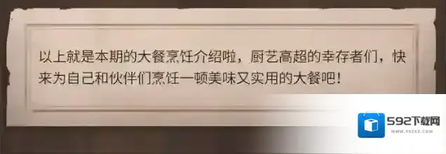 在过去的生存探索中,相信许多幸存者已经拥有了较高的厨师等级,那么大家想不想为自己的伙伴们做一顿更美味的高级大餐呢?