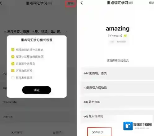 4、在重点词汇学习部分,从模式设置上可以看出共有5种学习方式,自定义学习方式为4种。在学习过程中,左下角有不再学选项,对已经掌握的单词可以直接Pass。