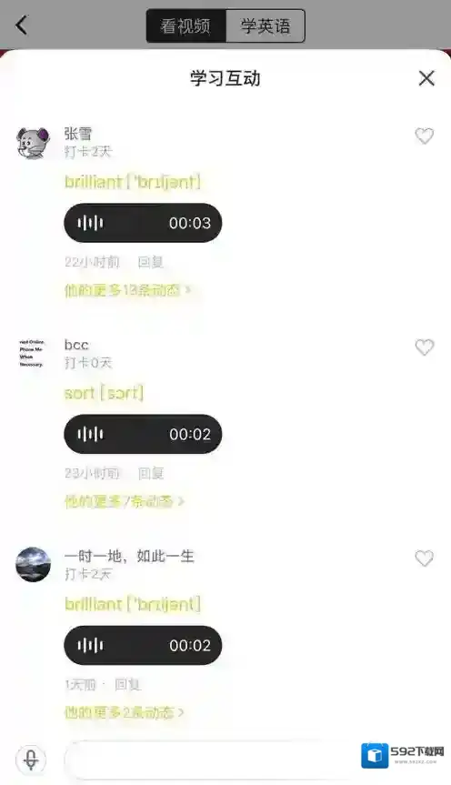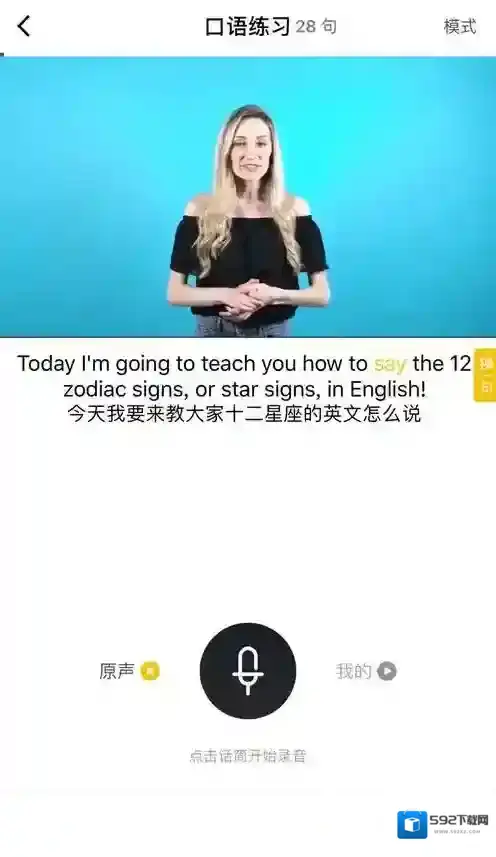 6、在口语练习部分,设置了跟读,用户可播放跟读录音,也可反复听原声,系统会实时对你的发音进行评价。另外,在口语练习中跟读的语音会同步到该视频的评论中哦~~