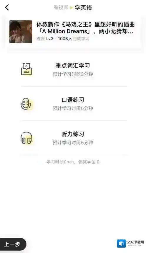 3、看完学习视频后,就进入了学习部分。学习部分由三部分组成:重点词汇学习、听力练习、口语练习。如果你只想训练某个薄弱项,直接点击想训练的部分即可。