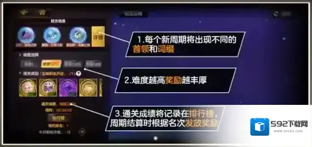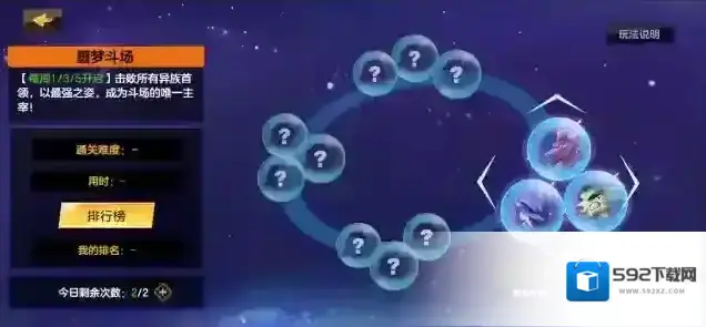 挑战有着不同的难度,每次挑战都将消耗相应次数,注意,即使你挑战失败,斗场也不会返还次数。在挑战前的准备时间,你会看见自己将要面对的首领,以及它们所在区域的加成(例如:降临后移动速度降低30%,攻击力提高100%),你可以通过调换首领所在区域改变他们的力量。
