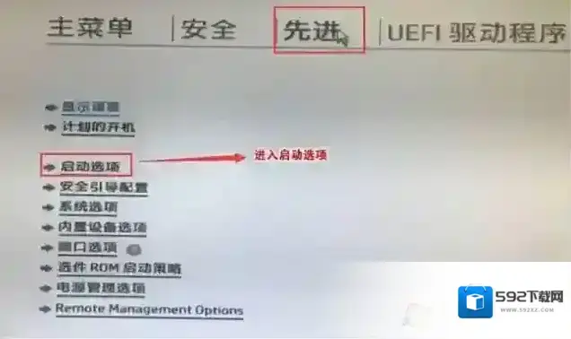 5、F10保存重启后再次开机按ESC,然后选择F10进入BIOS设置,将鼠标移动“先进”选项中,选择”启动选项”后回车进入,如下图所示: