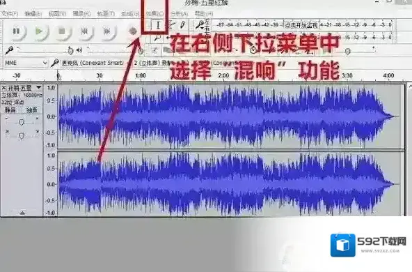 6、在右侧下拉菜单中,选择“混响”功能之后会跳出对话框;
