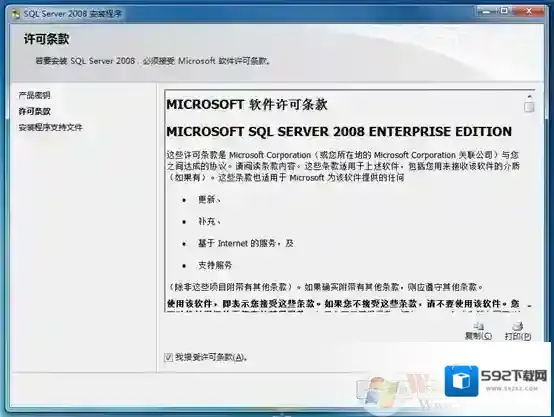 7、在许可条款界面中,需要接受Microsoft软件许可条款才能安装SQL Server2008,如图所示。