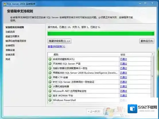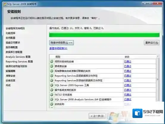 5、之后进入“安装程序支持规则”安装界面,安装程序将自动检测安装环境基本支持情况,需要保证通过所有条件后才能进行下面的安装,如图所示。当完成所有检测后,点击“确定”进行下面的安装。