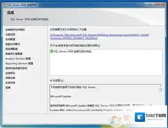 23、如图所示,此时SQL Server 2008完成了安装,并将安装日志保存在了指定的路径下。