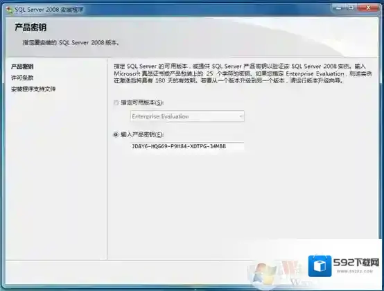 6、接下来是SQL Server2008版本选择和密钥填写,本文以“Enterprise Evaluation”为例介绍安装过程,密钥可以向Microsoft官方购买(或是百度查找),如下图所示。