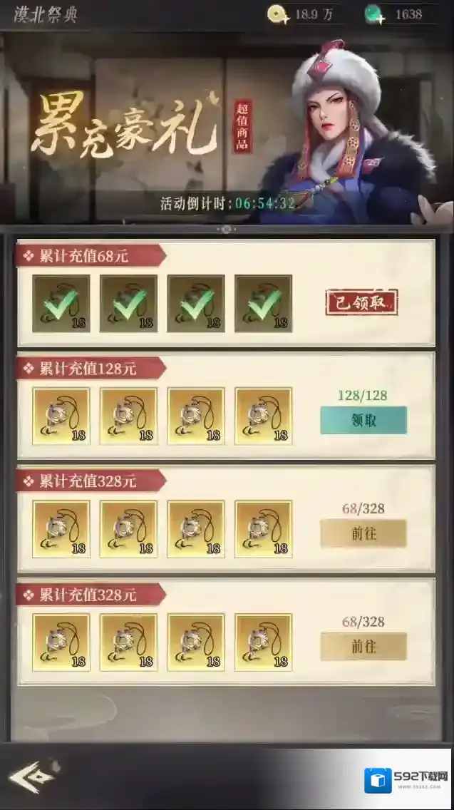 累计充值,尽享豪礼!在漠北祭典活动期间,玩家累计充值达到指定金额,即可领取相应的奖励。少侠们也可通过累充豪礼,获取超凡侠客降臣!