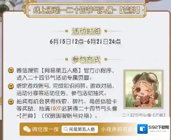 微信搜一搜网易第五人格官方小程序,进入二十四节气活动专属页面,绑定游戏账号、参与活动并完成任务,参与活动抽奖,抽满10次必得二十四节气头像-芒种。