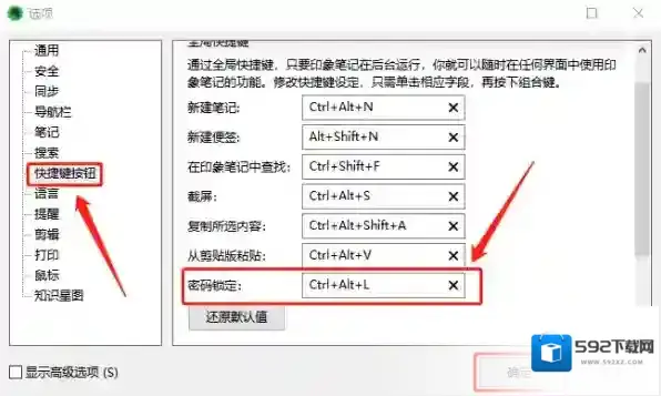 在选项窗口中,选择左侧的“快捷键按钮”选项,页面跳转后,下滑找到密码锁定一栏。点击对应选项右侧的方框,重新输入快捷键组合按钮,点击“确定”就修改好了。