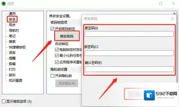 同样是在选项安全设置界面,点击密码锁设置中的“修改密码”按钮,在弹出的修改密码窗口中,输入旧密码和新密码,再点击“确定”键就能更改密码锁密码。