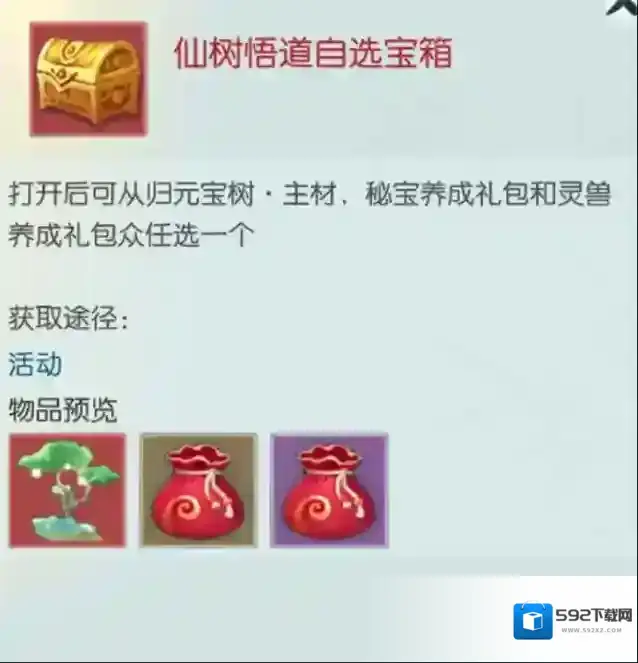 仙树最多结果3次,第三次会凝结仙树的本源之力,获得仙树悟道自选宝箱,包含归元宝树主材(得到道友反馈,本次优化为自选宝箱)。