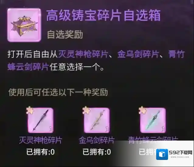 除金银双铃,本次活动也有高级铸宝返场,仙友们可在特惠礼包中获取高级铸宝碎片自选箱,可从灭灵神枪、金乌剑、青竹蜂云剑中任意选择一个。