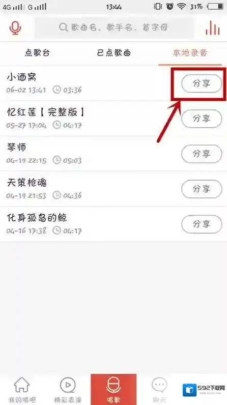 录音保存完毕后 在本地录音界面 选择刚刚录制的《小酒窝》作品后面的分享选项