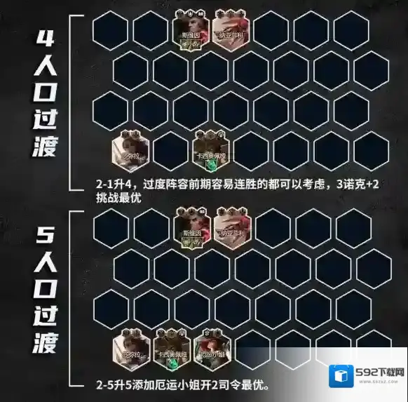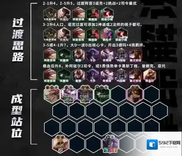 2-1升4,2-5升5,过度阵容3诺克+2挑战+2司令最优,其他如3艾欧、3虚空、3德玛西亚,前期容易连胜的都可以考虑,主打一个灵活看对局选择打工卡。
