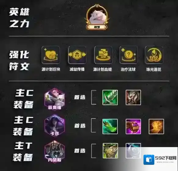这套阵容对装备需求不算太高,3德玛西亚给菲奥娜提供1件光明装备(斯特拉克的究极盾牌),我们只需要再给她找2件装备就行。