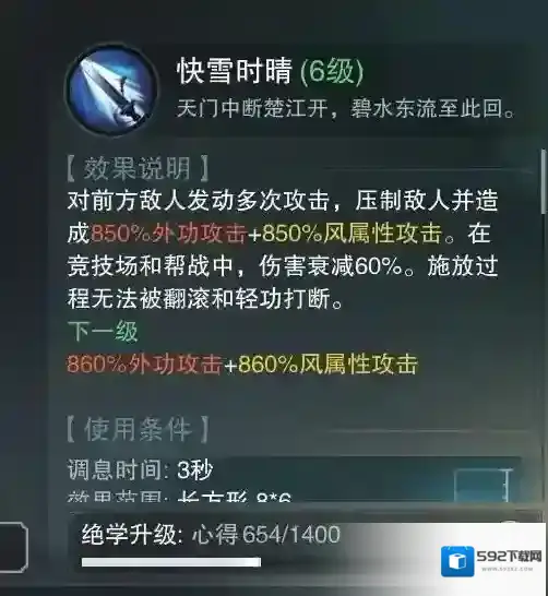 快雪时晴:非常牛一个绝学技能,也是非常挫的一个技能。大招前两次直接可以群体挑飞,空中持续攻击不掉下来。绝学需要靠技能和普攻积攒满怒气释放,华山的高爆发注定不会打很久,反正我打那么多场论剑,基本没用出来过,基本也就是打本和多人战场的时候能用出。