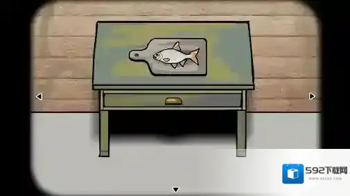 1、木桌视角:拾取桌脚处的(鱼线),倚靠在柜子上的(鱼竿),在抽屉里获得(刀)。