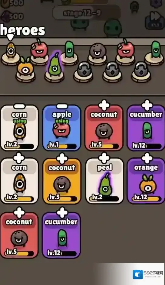 1、不同的水果蔬菜英雄等你去召唤来战斗,丰富的英雄角色可以自由选择来上阵战斗。