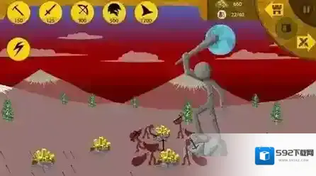 游戏初期,玩家仅拥有矿工和棍棒手两种兵种,矿工负责开采矿石以获取经济资源,但需注意,矿工脆弱且易受敌方攻击,因此需建造士兵保护他们。