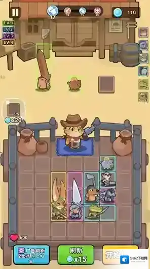 2、进入关卡后玩家可以选择初始英雄进行战斗,相同品质的英雄可以合并来提升等级。
