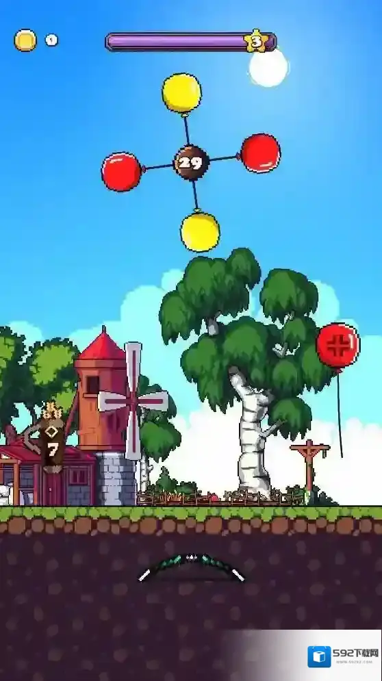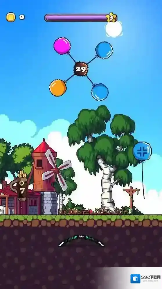 游戏里的玩法比较简单,就是发射弓箭射击气球,当关卡里的气球全部被击破就可以通关。需要注意的是每次需要击破的气球是有顺序的,玩家需要根据关卡给出的气球颜色来发射弓箭击破气球,如果击中错误的气球就会减少闯关时间,如果不能再规定时间内完成就会闯关失败。