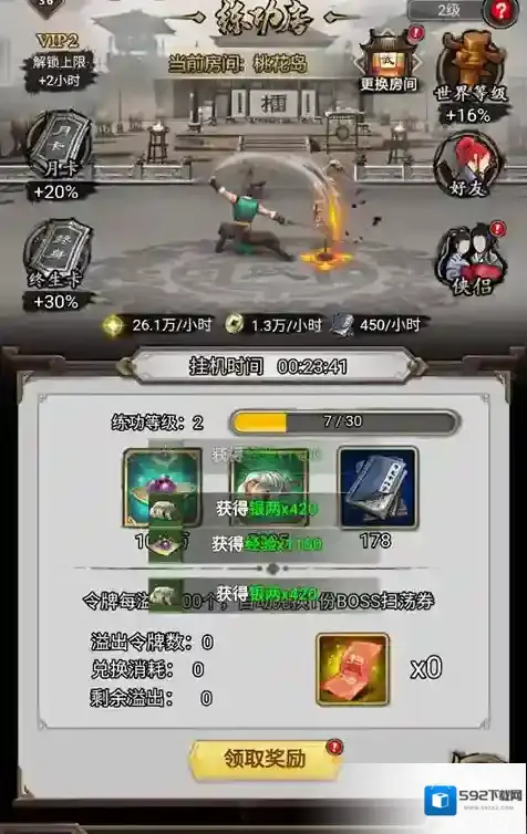 在练功房里,玩家可以悠闲离线挂机,获得丰厚的经验、银币、武学卡和BOSS扫荡券等奖励,练功时间越长,奖励越丰富,最长可达8小时。