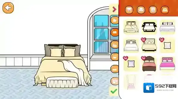 3、进入房间后点击右上角的按钮可以进入装饰界面,在这里你可以自由更换不同的家具物品。