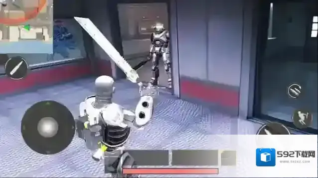 2、利用虚拟摇杆控制机甲移动,在废墟战场中搜寻敌方与补给资源。