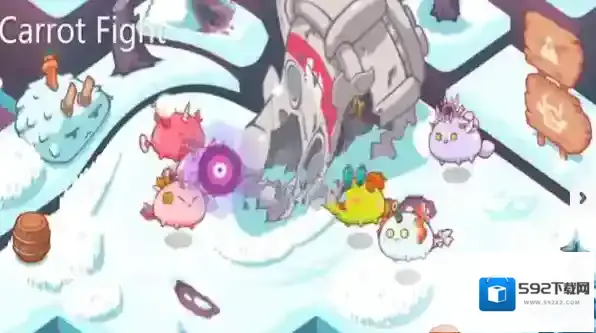 1、在Carrot-Fight首场景,点击箭头指向的紫色角色,触发互动(战斗/任务),推进游戏。
