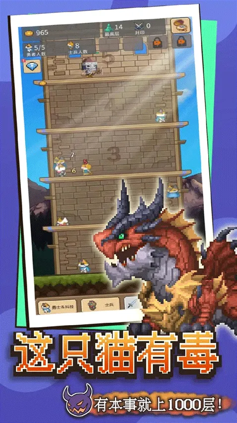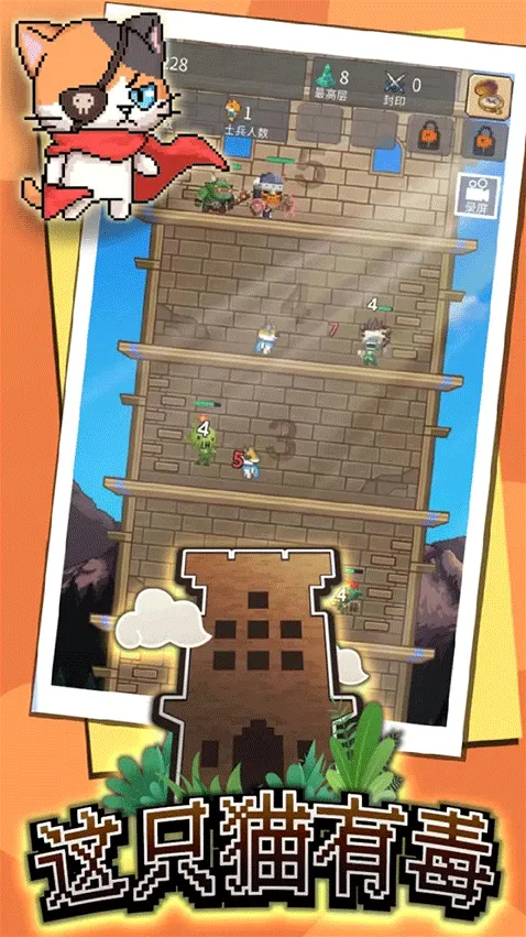 这只猫有毒是一款以爬塔为核心玩法的休闲游戏,猫之王国被魔王攻破了,公主被魔王掳走并关在了一座千层高的塔楼上,国王焦急万分,这时,一群身批斗篷的勇者冒了出来,它们向国王表示愿意前往高塔拯救公主,国王非常高兴,承诺派出士兵任由勇者调配,就这样,一支魔王征讨部队出发了…游戏采用简单的点击式玩法,不吃操作,更注重策略,比较适合闲暇之余游玩,堪称杀时间利器。