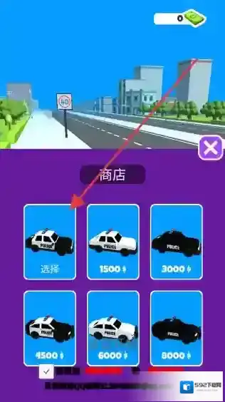2、进入商店界面,可选择已拥有的警车(如第一个“选择”),或花费金币购买其他警车,驾驶对应警车执行道路任务。