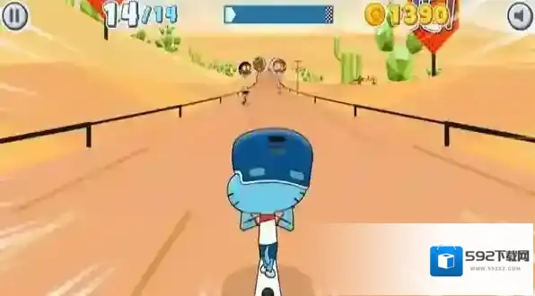 2、赛道跑酷操控戴蓝头盔的角色,在公路赛道滑行,躲避障碍,收集金币(000→015),完成“14/14”关卡目标。