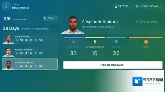 3、不同的员工等你去招募,每位员工都有不同的属性等你去选择。