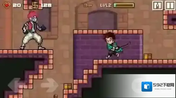 2、左上角显示红心数量为20,货币数量为128,等级标识为“LVL2”,画面中有两个角色,一名持剑的角色准备攻击上方平台的敌人。