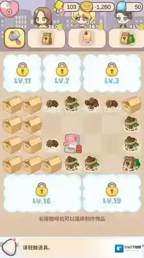 2、点击咖啡机可以获得各种物品,两个相同的物品可以合成更高的等级。