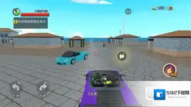 2、驾驶紫色汽车,按箭头指引前往指定地点,注意避让,准时送达货物。