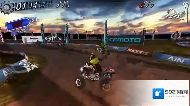 2、在“CAREER”模式,驾驶蓝白ATV,沿越野赛道,避障碍、超对手,积累比赛经验。
