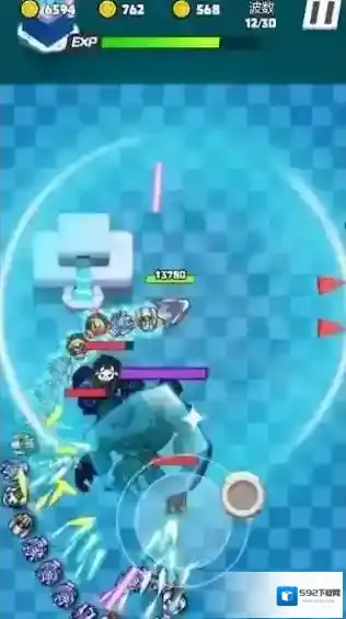 1、画面有“使用摇杆来移动”操作提示,显示经验(EXP)、金币等资源,还有波次(1/10)等信息。