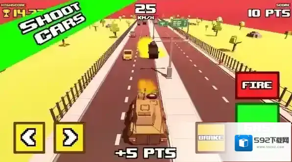 2、在公路场景操控坦克,利用左右箭头按钮转向,“GAS”键加速、“BRAKE”键减速,“FIRE”键射击,需在限时(00:35)内摧毁指定数量车辆(0/5)。
