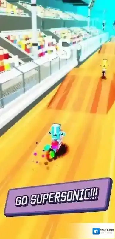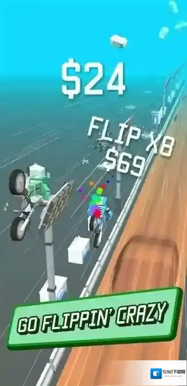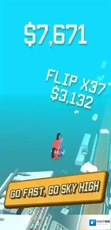 3、竞速中遇到“HOLD TO FLIP!”标识,长按触发空翻特技,在空中翻转时,调整长按时长、时机,精准落地保持速度,利用特技跨越障碍、拉开差距,在完成特技的同时冲刺终点。