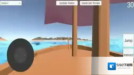3、界面有许多调试按钮,还有“Jump”(跳跃)、“Interact”(交互)操作按钮,场景呈现海洋及船只甲板。
