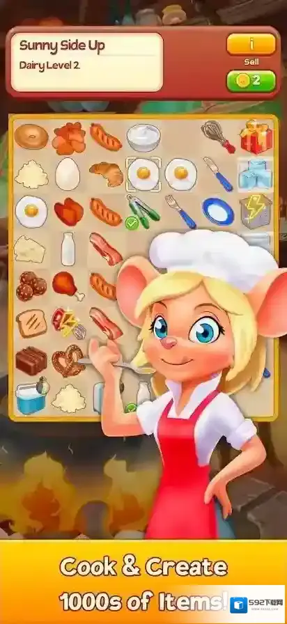 2、拖动两个冰块或其他相同物品进行合并,就能生成新的东西;棋盘上的食材和工具摆放得较为杂乱,种类丰富,等待你去整理与合成。