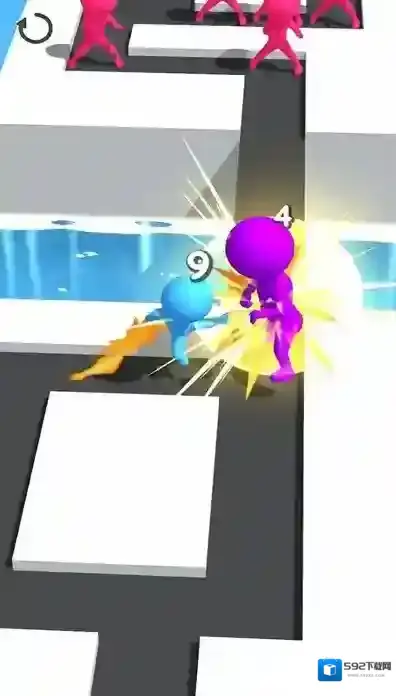 1、画面中有不同颜色的小人(蓝色、粉色、紫色),部分区域标有数字(1、2、4),红色箭头指示操作方向。