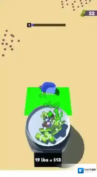 3、将装有小球的容器拖到绿色“SELL”区域的秤上,秤会显示小球重量(如6lbs),完成售卖获取金币,通过售卖小球变现,用金币去升级容器。