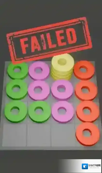 3、第三关出现红、蓝、绿、黄多种颜色圆环,优先处理箭头指向的蓝色圆环,将其精准移到蓝色专属列,按颜色分类归位,使所有圆环各就其位,顺利通关。