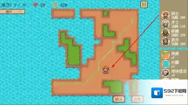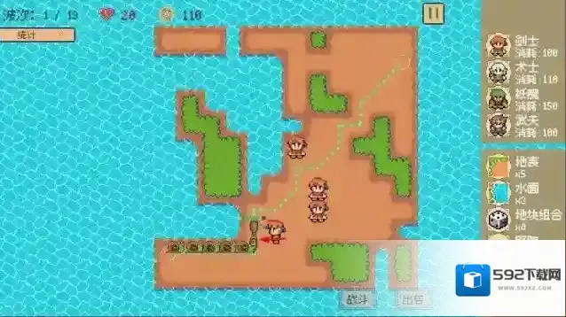 1、“兵种部署”,消耗金币,在岛屿路径布置剑士、术士等兵种,构建防御线。