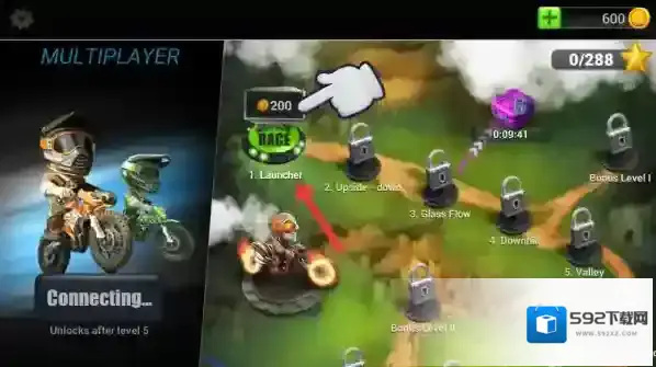1、单人闯关模式:从初级山地赛道开始挑战,逐步解锁高难度关卡,完成三星通关目标可获取钻石奖励与改装蓝图。